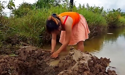 Oriental playgirl gets wet from being manhandled outdoors